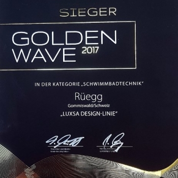 Lukas Rüegg konnte am Donnerstag, 30. März 2017, für LUXSA® den Golden Wave Award 2017 in Stuttgart entgegennehmen. Europas grösstes Pool & Spa Magazin Schwimmbad + Sauna zeichnet, mit einer 7-köpfigen Fachjury, mit diesem Award alle zwei Jahre Innovationen in der Branche aus. Mit den Schwimmbad Armaturen von LUXSA® steht erstmals ein komplettes Sortiment zur Verfügung, das mit Funktionalität, Design und neuem Montagesystem überzeugt.